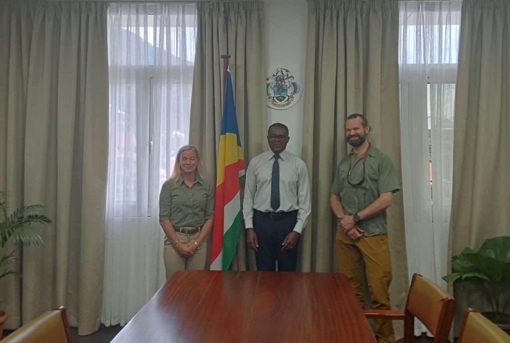 The Renowned wildlife specialist was accompanied by one of her colleague Mr. Jasper Stagegaard paid a Courtesy visit to the Honorable Minister for Agriculture, Climate Change, and Environment, Minister Flavien Joubert, to discuss strategies for an effective stray dog control. The Minister welcomed Dr. Hard by expressing the Government interest to collaboratively joint effort in determining ways to deal with the situation of feral dogs in the country. Discussion elaborated more on the emphasis for specialize training for the Animal Welfare staff as Seychelles aim is to have top level performance for the animal welfare in terms of competency.